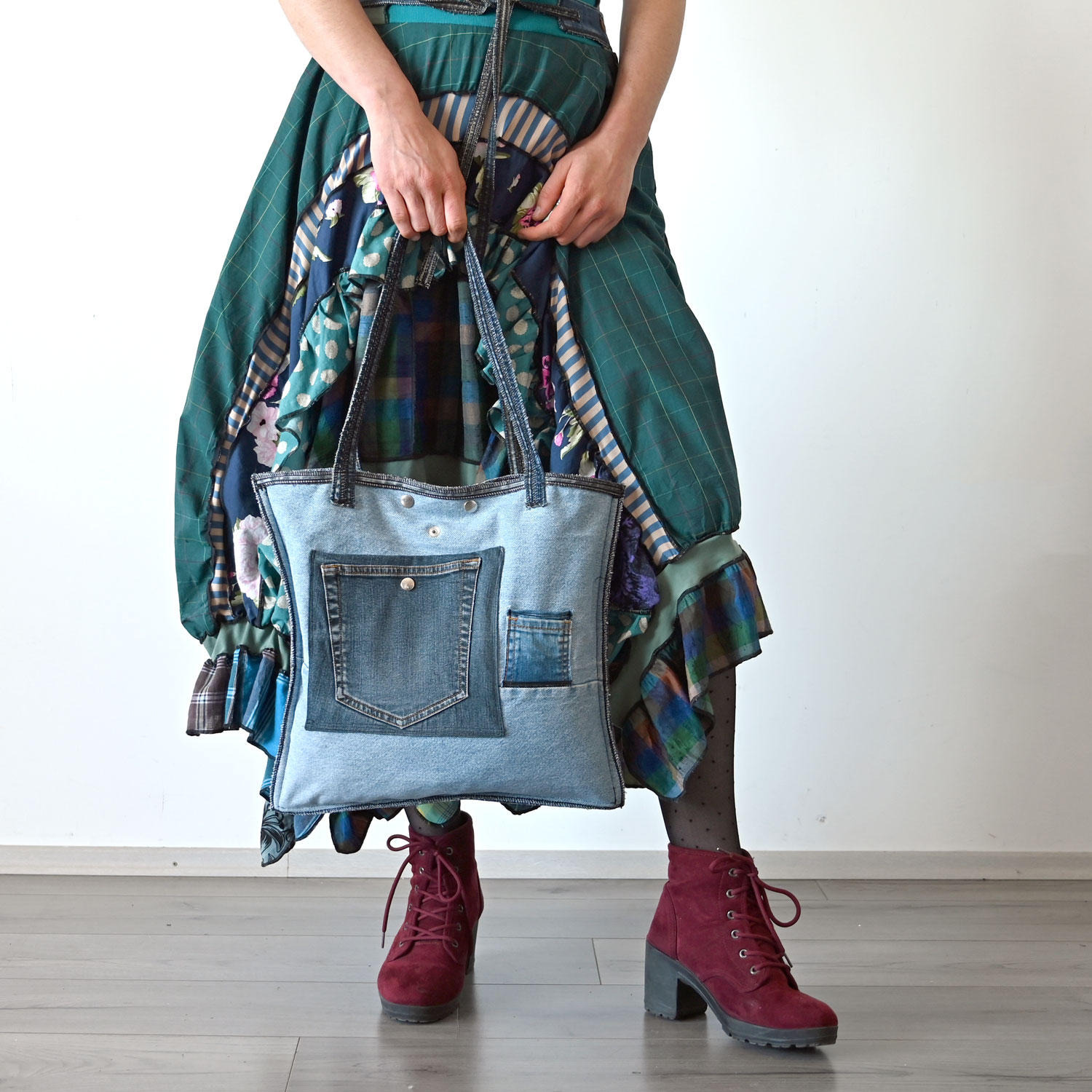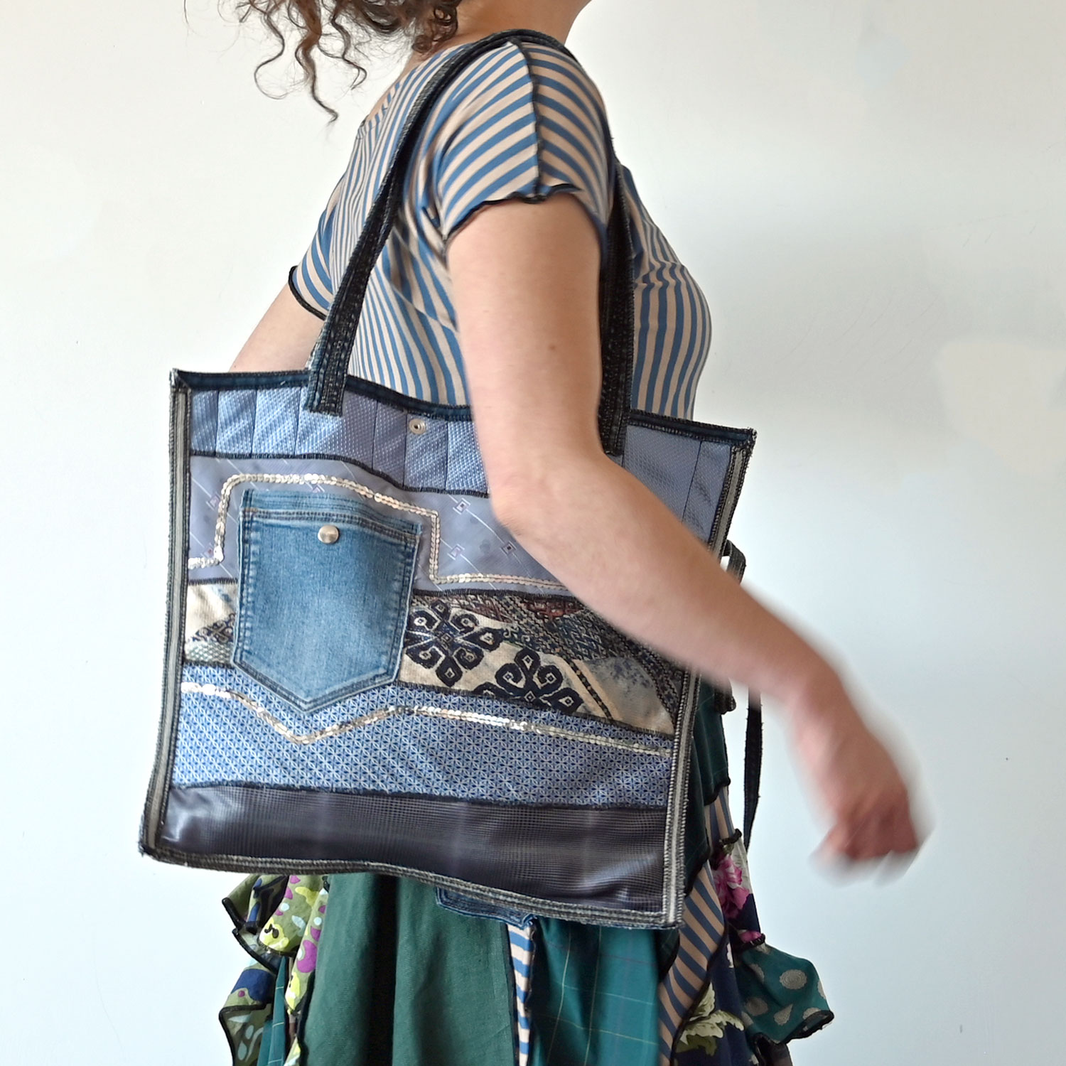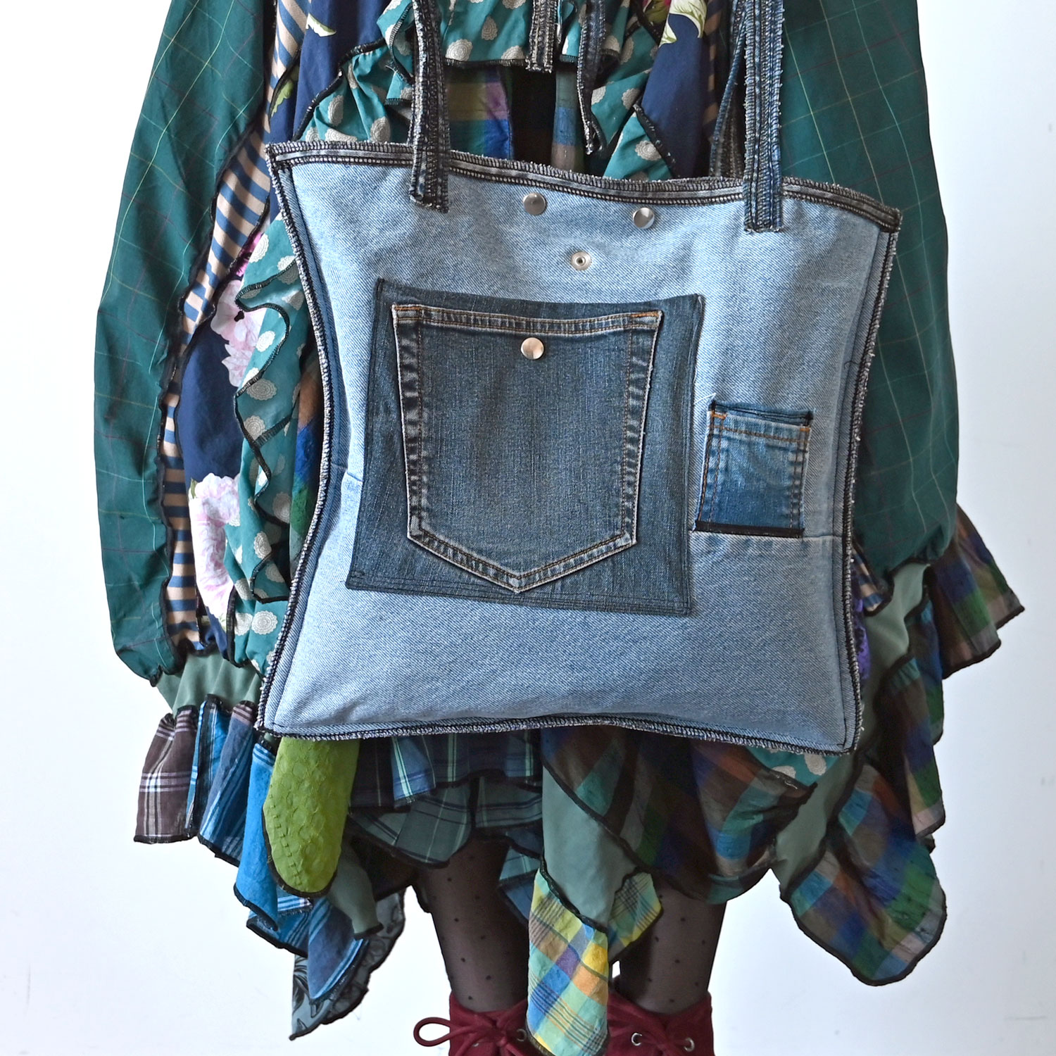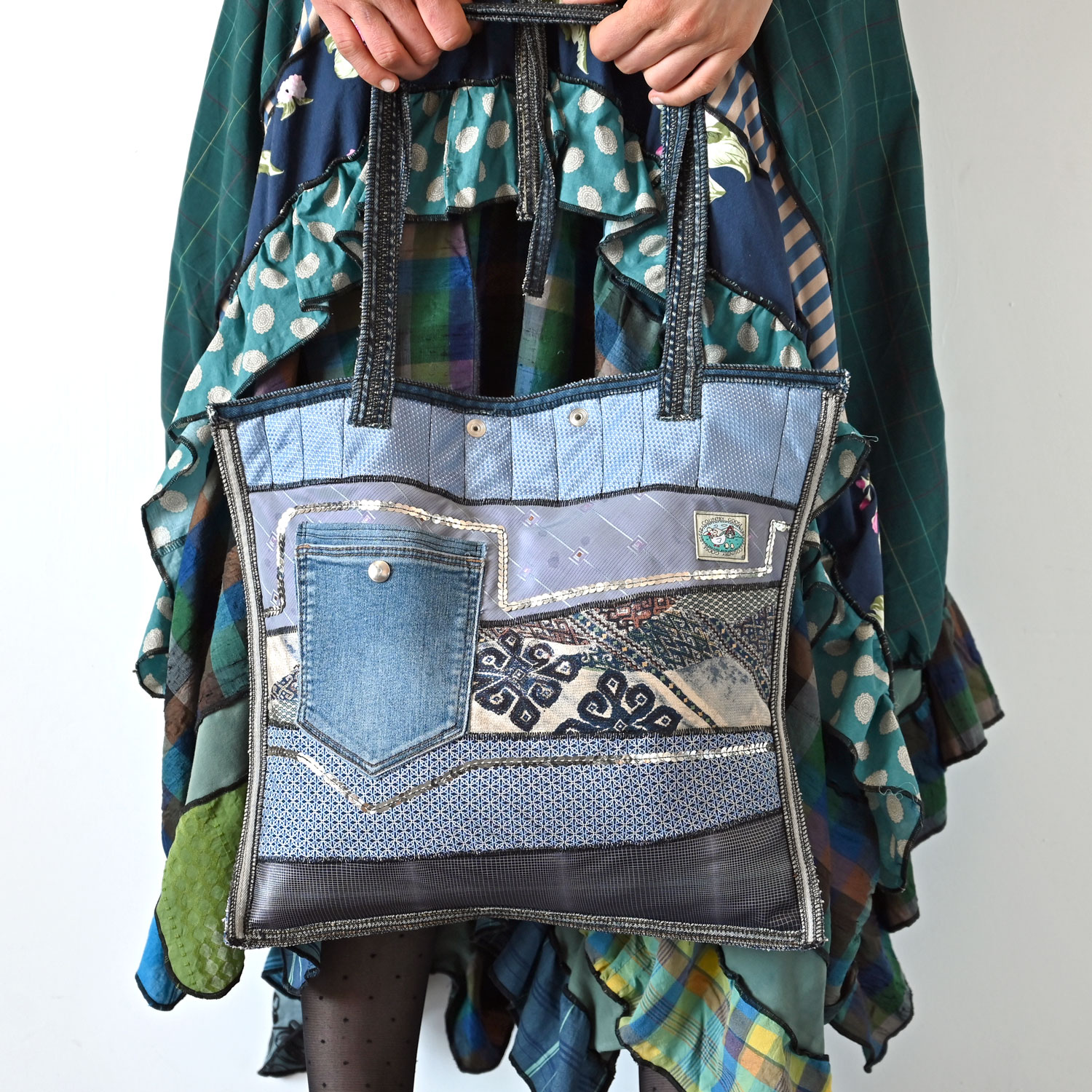A large bag made of upcycled neckties and jeans, padded, with three outer and one inner pocket.