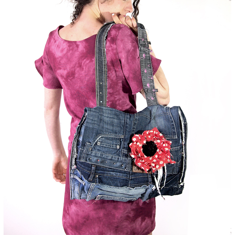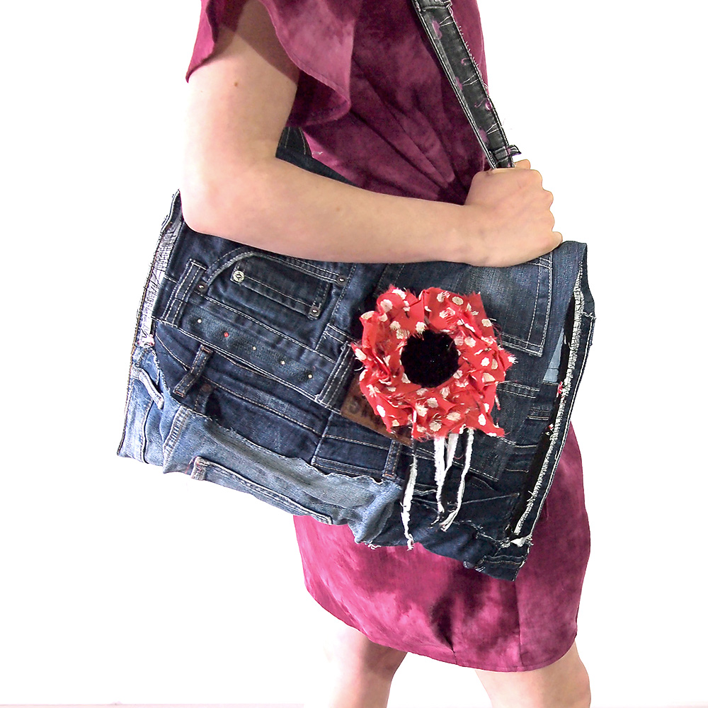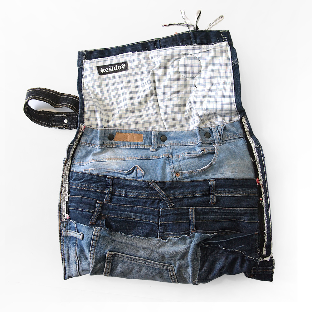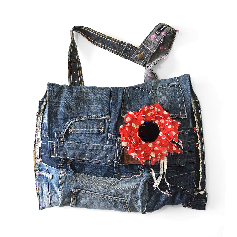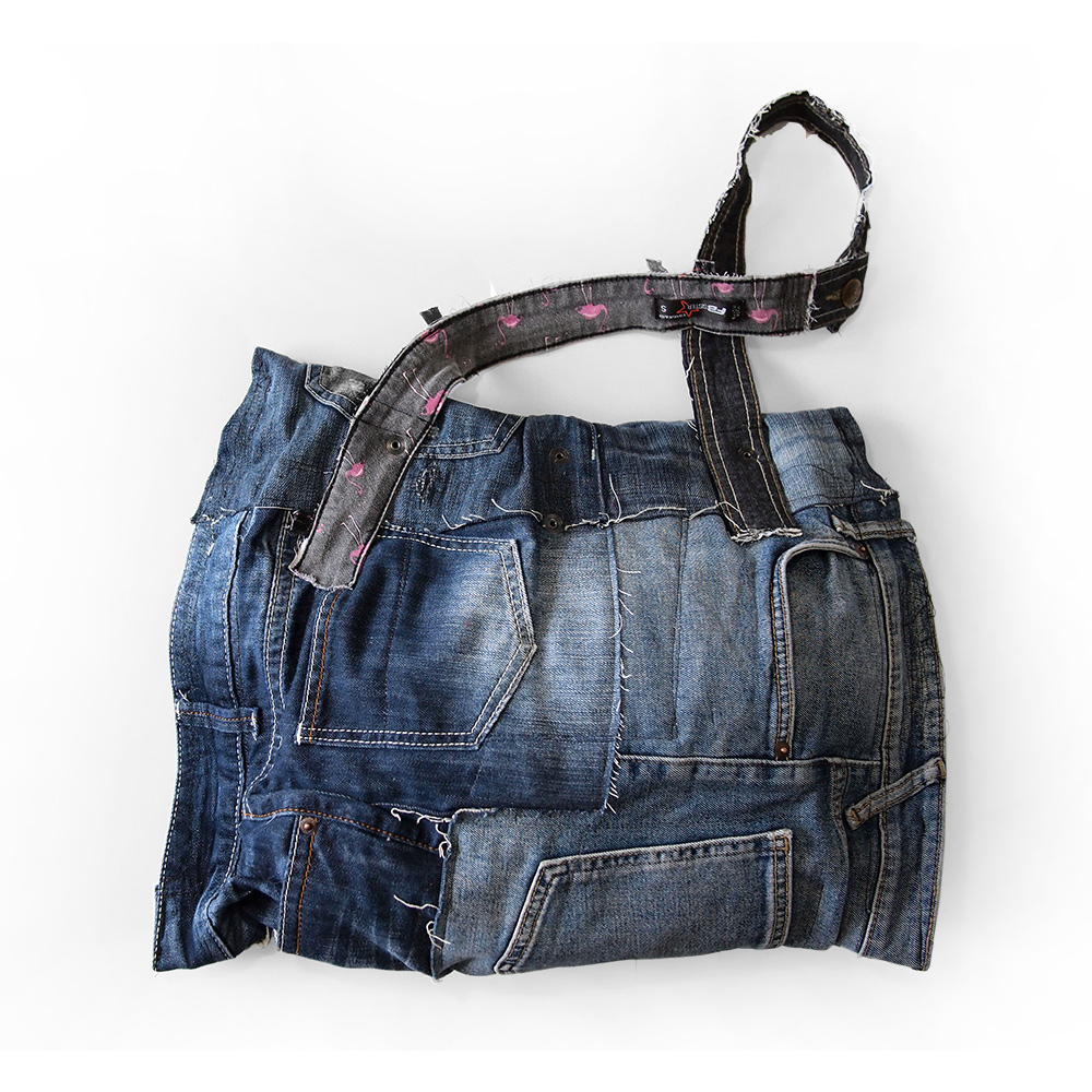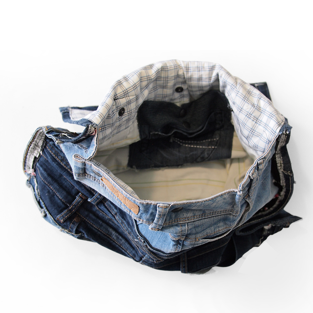Completely upcycled denim bag, lined with cotton fabric, also recycled. With double inside pocket and drucker buckle.