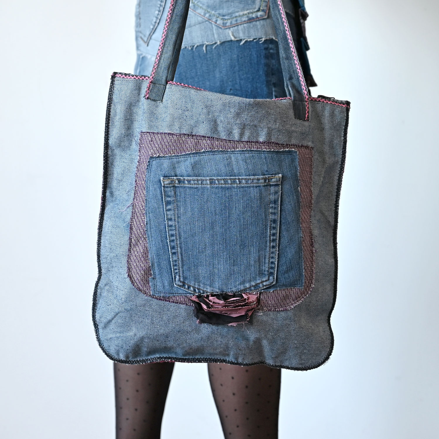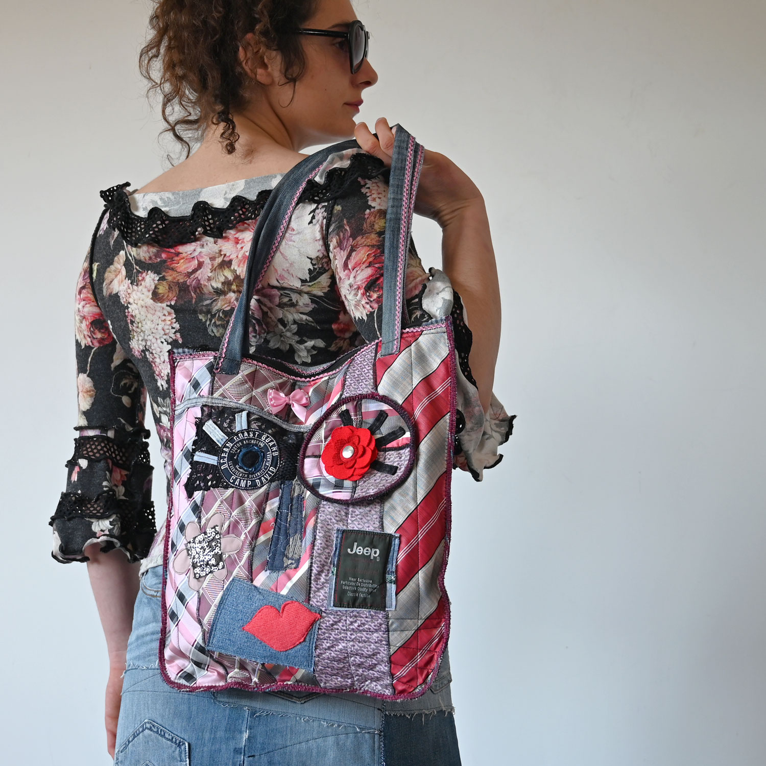 A large upcycled neck-ties bag, with a zipper and two pockets. Dimensions approx. 36 x 40 cm, handle length 66 cm.