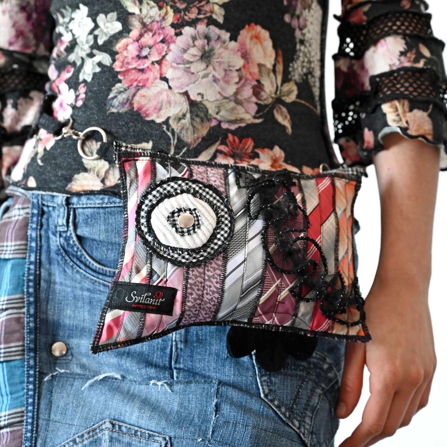 A bag made of upcycled ties with adjustable handles, designed to be worn around the waist, on the shoulder or in the hand.