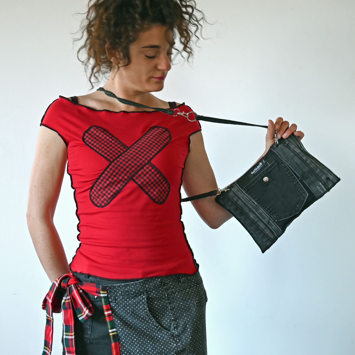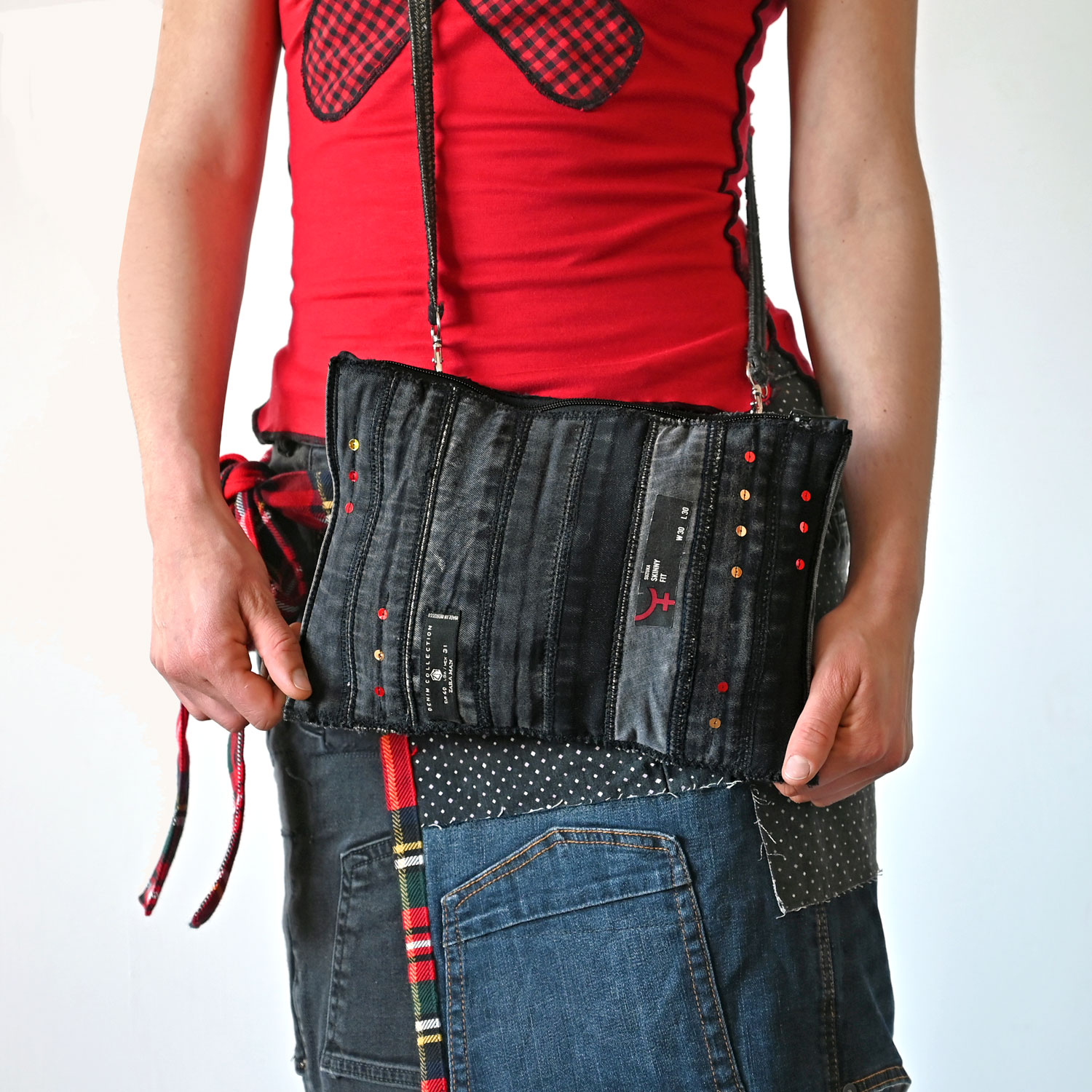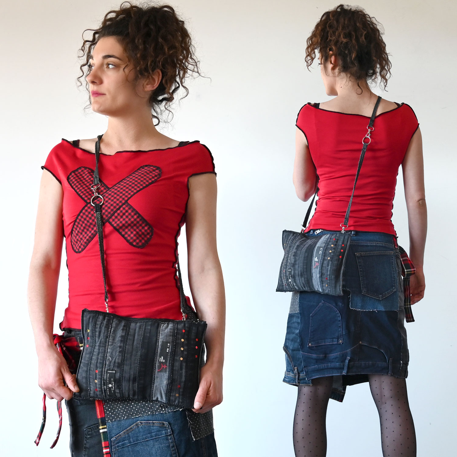 A bag upcycled from jeans straps. Dimensions approx. 30 x 21 cm. With inner and outer pocket on the back. Adjustable handle length.