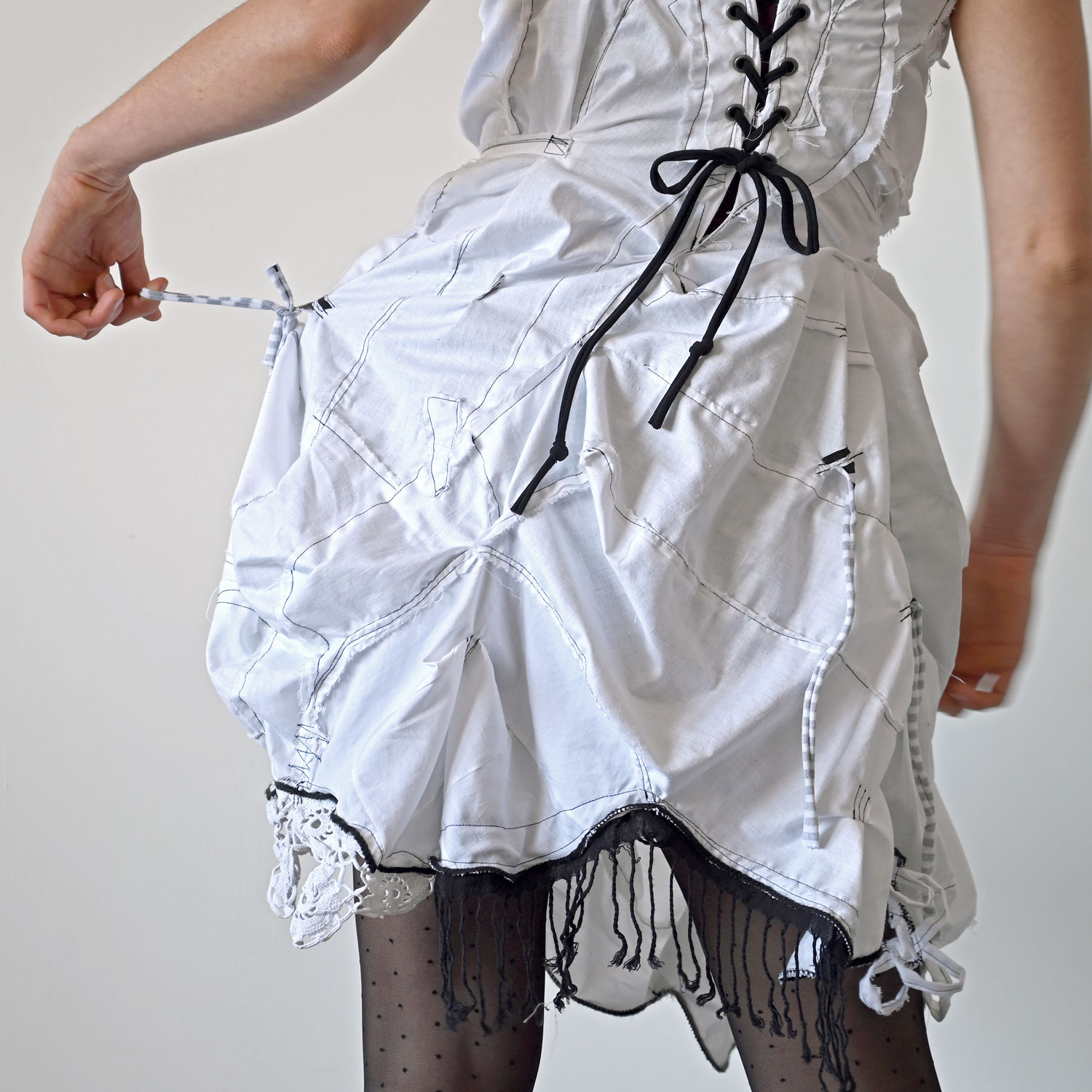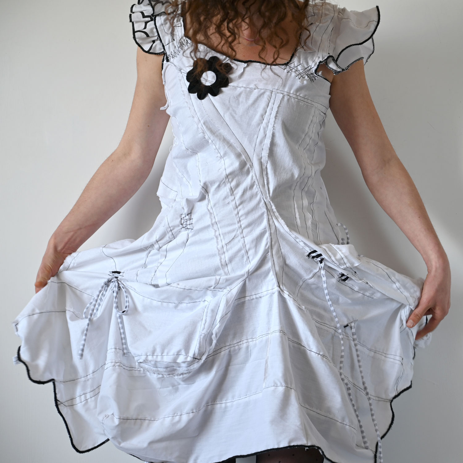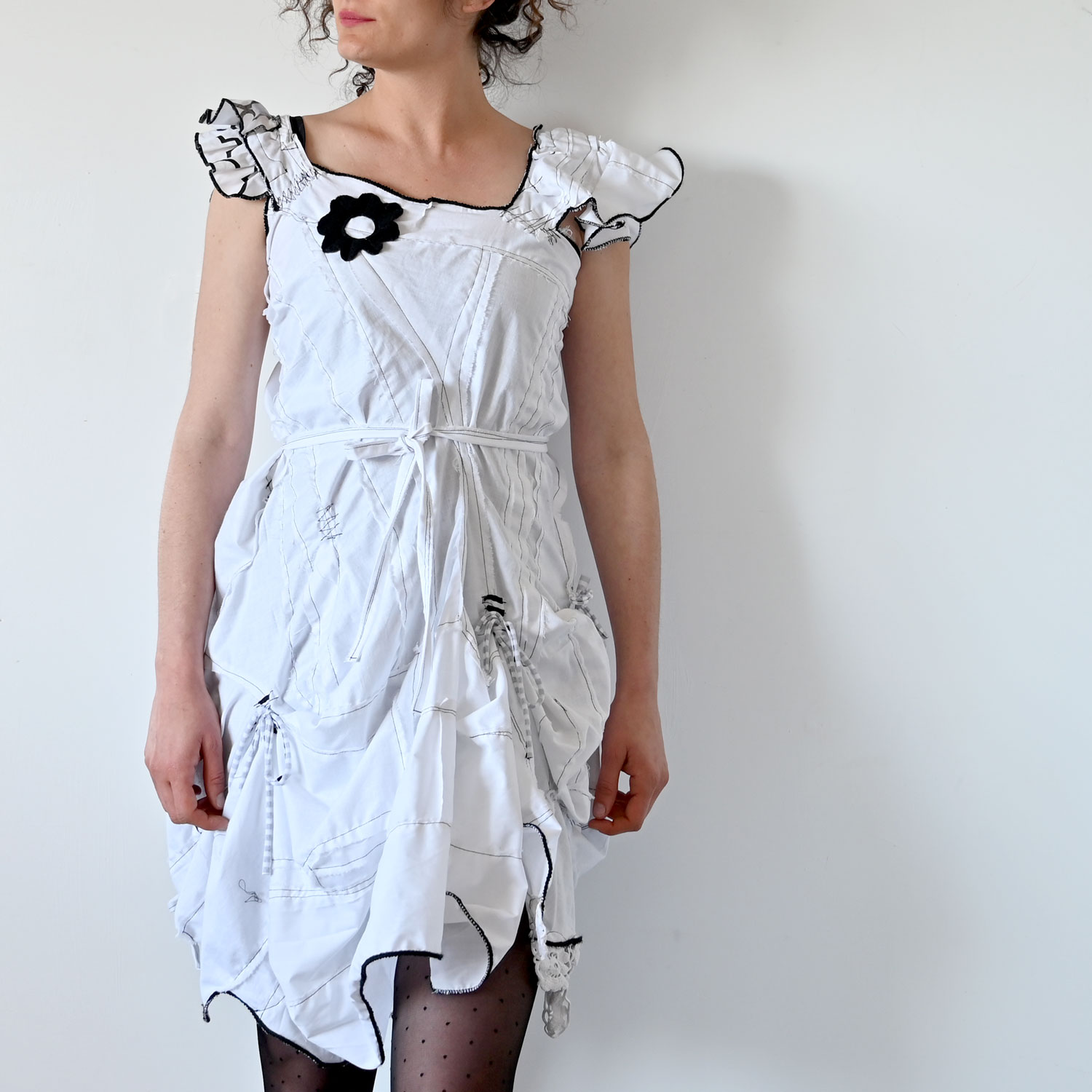 Exciting white cotton dress with black details. It is sewn in a free style. Despite the raw appearance, all seams are carefully finished and maximally durable.