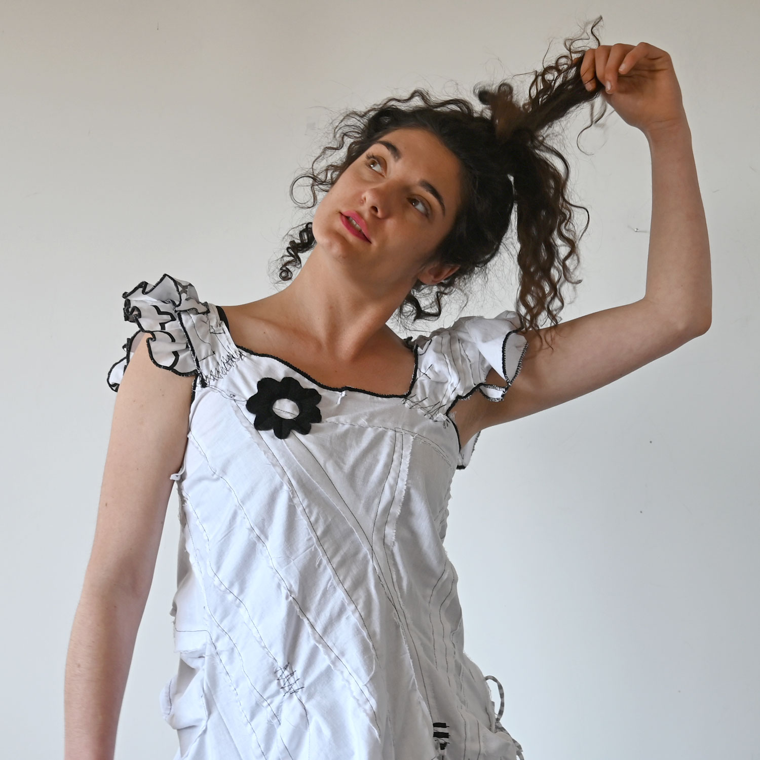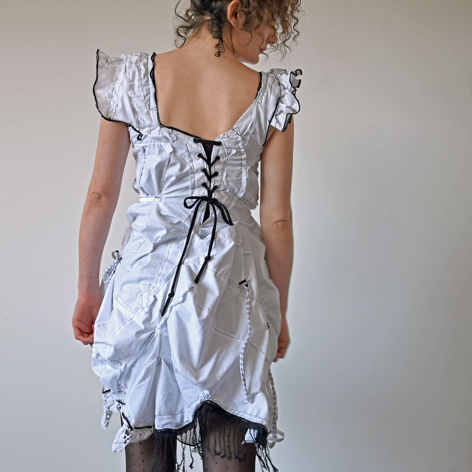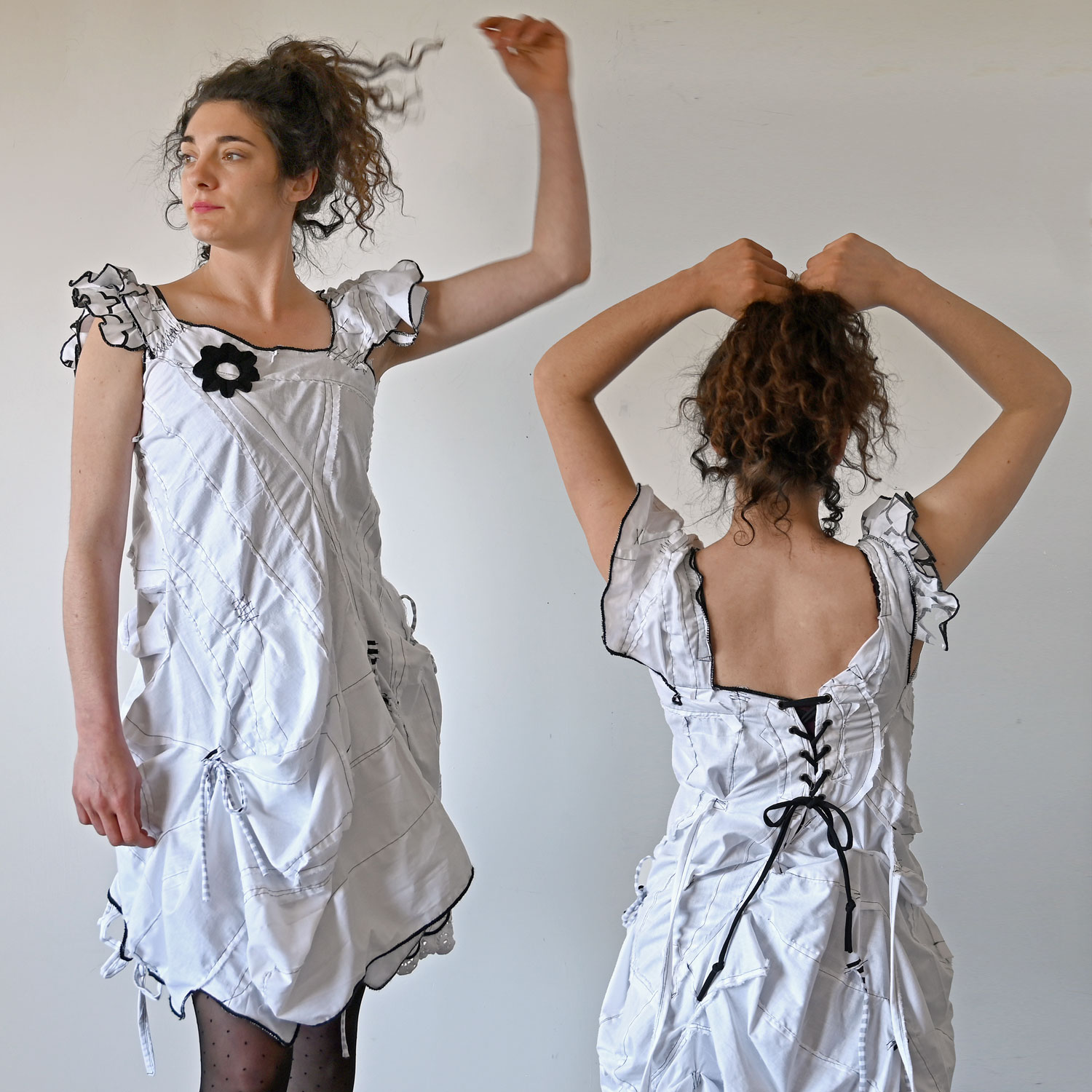 Exciting white cotton dress with black details. It is sewn in a free style. Despite the raw appearance, all seams are carefully finished and maximally durable.